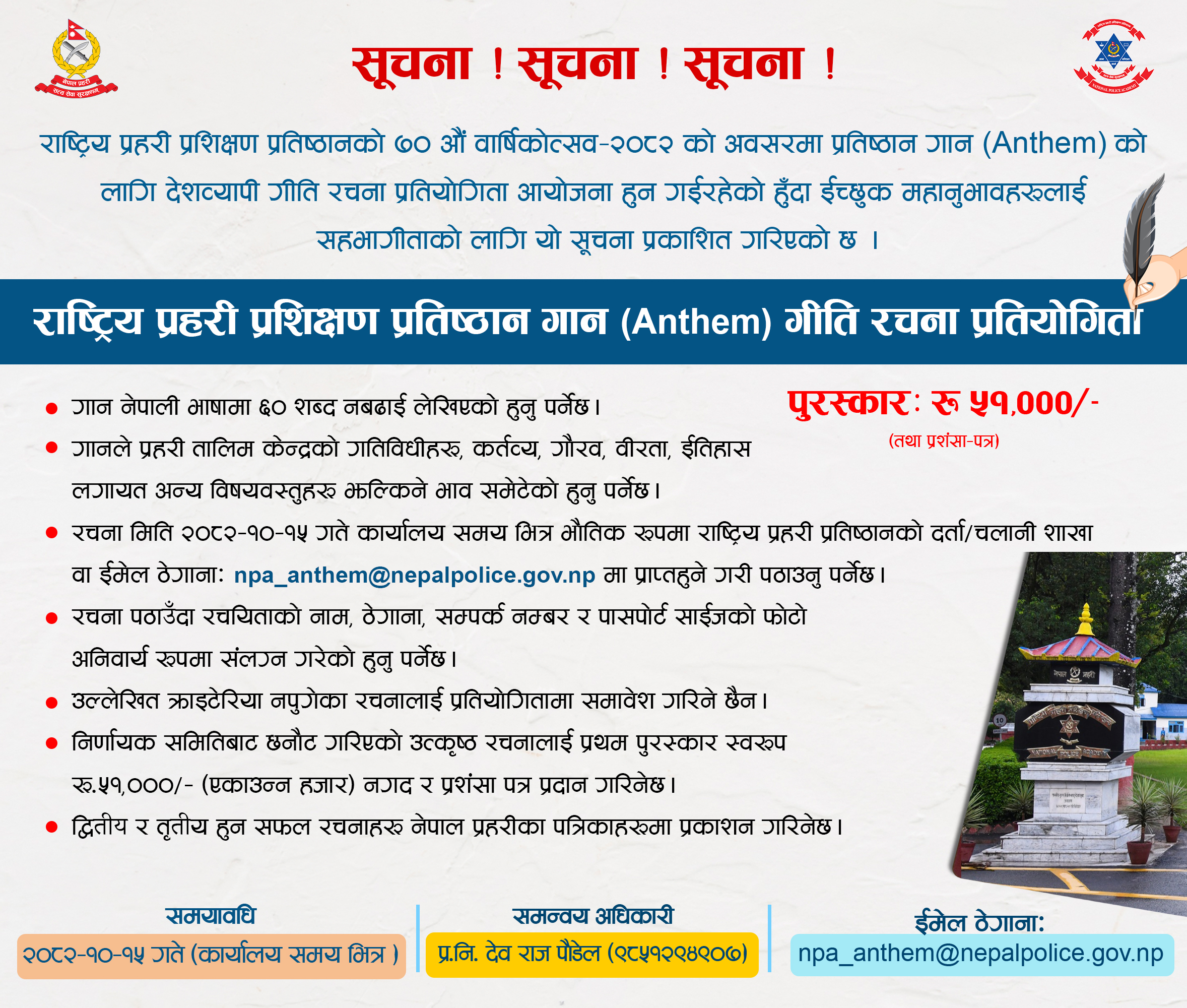 | २०८२-०९-२१ | राष्ट्रिय प्रहरी प्रशिक्षण प्रतिष्ठान गान (Anthem) गीति रचना प्रतियोगिता सम्बन्धी सूचना ! | |