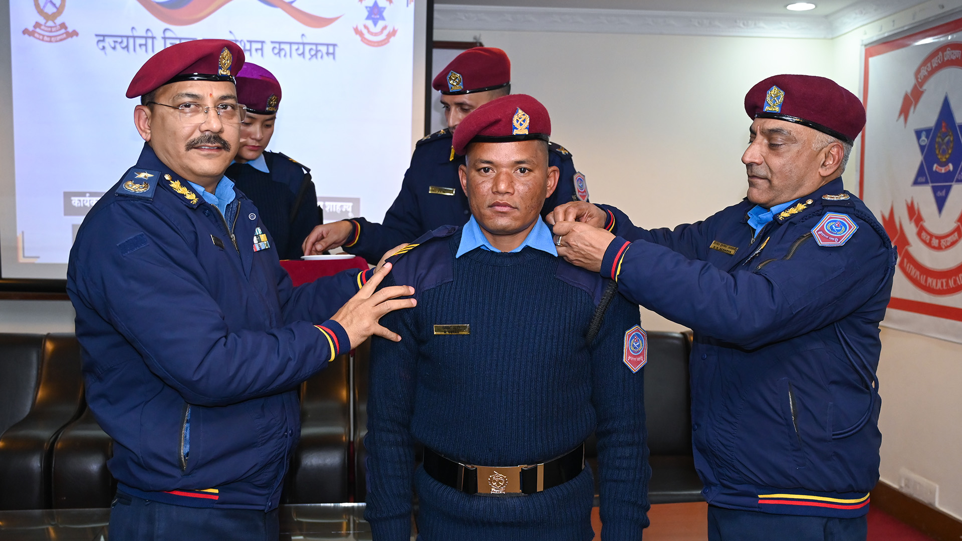 जनपद प्रहरी समूह तर्फको प्रहरी हवल्दार पदबाट प्रहरी वरिष्ठ हवल्दार, प्रहरी सहायक हवल्दार पदबाट प्रहरी हवल्दार र प्रहरी जवान पदबाट प्रहरी सहायक हवल्दार पदमा बढुवा हुनुभएका प्रहरी कर्मचारीहरूलाई आज मिति २०८२/१०/१३ गते राष्ट्रिय प्रहरी प्रशिक्षण प्रतिष्ठानका कार्यकारी निर्देशक प्रहरी अतिरिक्त महानिरीक्षक श्री शिद्धी बिक्रम शाहज्यूको प्रमुख आतिथ्यतामा दर्ज्यानी चिन्हद्वारा सुशोभन कार्यक्रम सम्पन्न । उक्त कार्यक्रममा प्रतिष्ठानका निर्देशक, सह-निर्देशक, उप -निर्देशक लगायत अन्य सिनियर प्रहरी अधिकृतहरूको समेत उपस्थिति रहेको थियो ।
