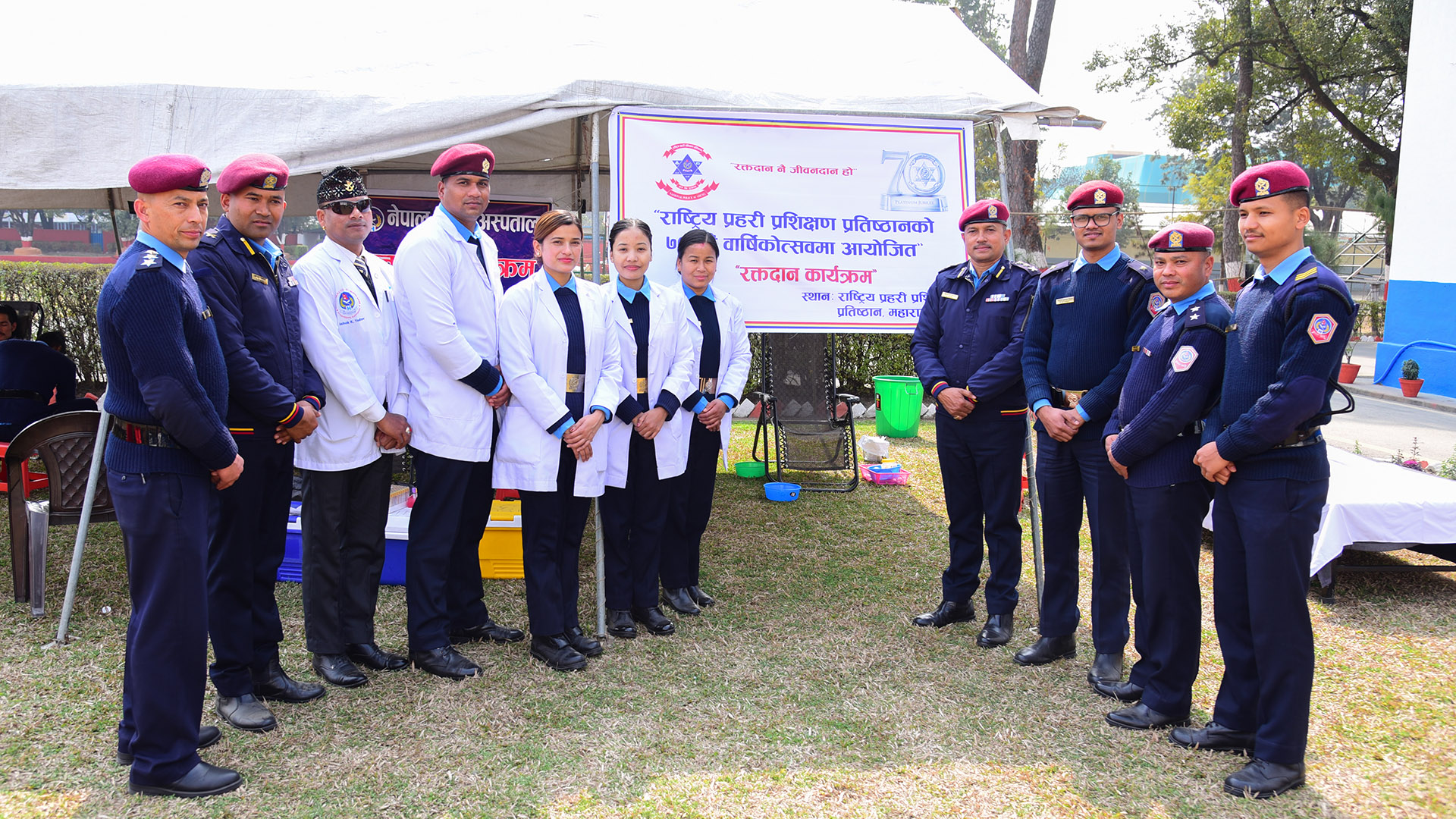 आज मिति २०८२ माघ २५ गते राष्ट्रिय प्रहरी प्रशिक्षण प्रतिष्ठान, महाराजगञ्जको ७० औं बार्षिकोत्सको उपलक्ष्यमा आयोजित रक्तदान कार्यक्रम प्रतिष्ठानका निर्देशक प्रहरी नायव महानिरीक्षक श्री दिनेश कुमार आचार्यज्यूको प्रमुख आतिथ्यतामा सम्पन्न भयो । उक्त कार्यक्रममा प्रतिष्ठानका सह निर्देशक, नेपाल प्रहरी अपराध अनुसन्धान विद्यालयका प्रधानाचार्य, उप निर्देशक, सिनियर प्रहरी अधिकृत, जुनियर प्रहरी अधिकृत तथा प्रतिष्ठानमा कार्यरत प्रहरी हवल्दार तथा जवानका साथेै विभिन्न उन्नत तथा आधारभूत तालिमका प्रशिक्षार्थीहरुका साथै सर्वसाधारणको समेत उल्लेखनीय सहभागिता रहेको थियो ।