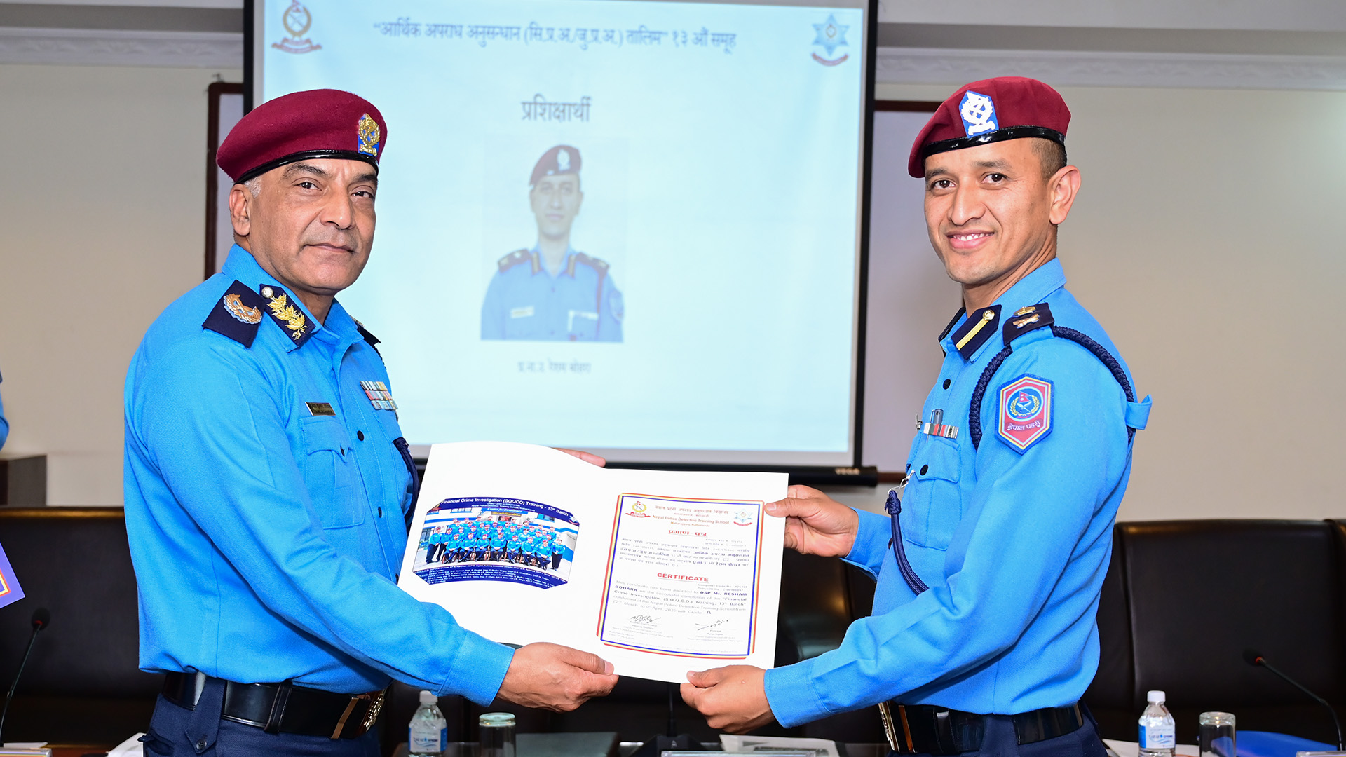 नेपाल प्रहरी अपराध अनुसन्धान विद्यालय, महाराजगञ्जमा सञ्चालन भएको आर्थिक अपराध अनुसन्धान तालिम १३ औं समूहको आज मिति २०८२/१२/२६ गते नेपाल पुलिस स्टाफ कलेज तथा यस प्रतिष्ठानका निर्देशक प्रहरी नायव महानिरीक्षक श्री दिनेश कुमार आचार्यज्यूको प्रमुख आतिथ्यतामा सम्पन्न भयो । उक्त कार्यक्रममा प्रशिक्षार्थीहरूलाई प्रमाण-पत्र वितरण गर्नुका साथै प्रमुख अतिथिज्यूले निर्देशन सम्बोधन गर्नु भएको थियो भने तालिम संयोजक प्रहरी नायव उपरीक्षक हेमराज घिमिरेले तालिम सम्बन्धी प्रतिवेदन समेत प्रस्तुत गर्नु भएको थियो ।
